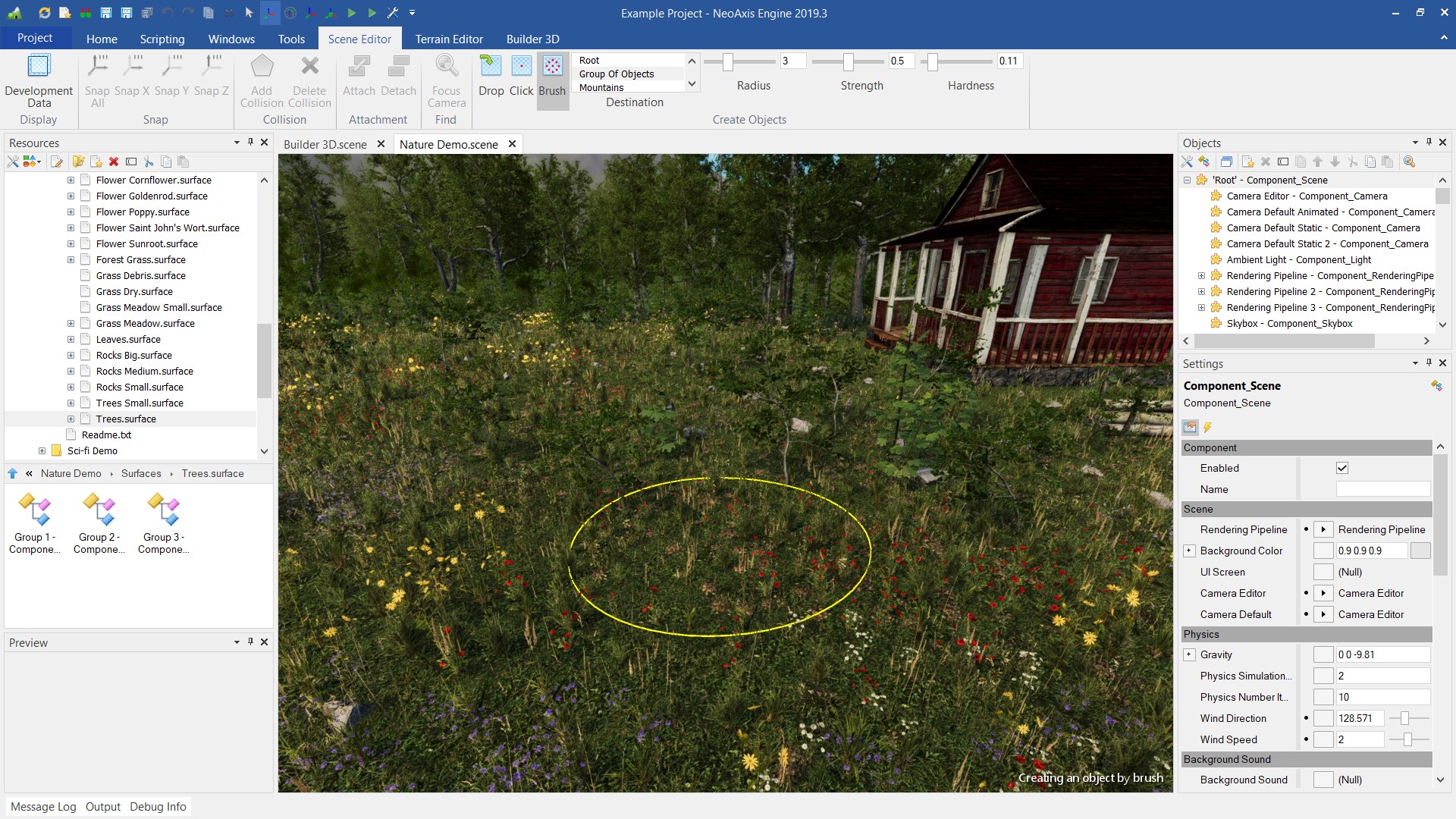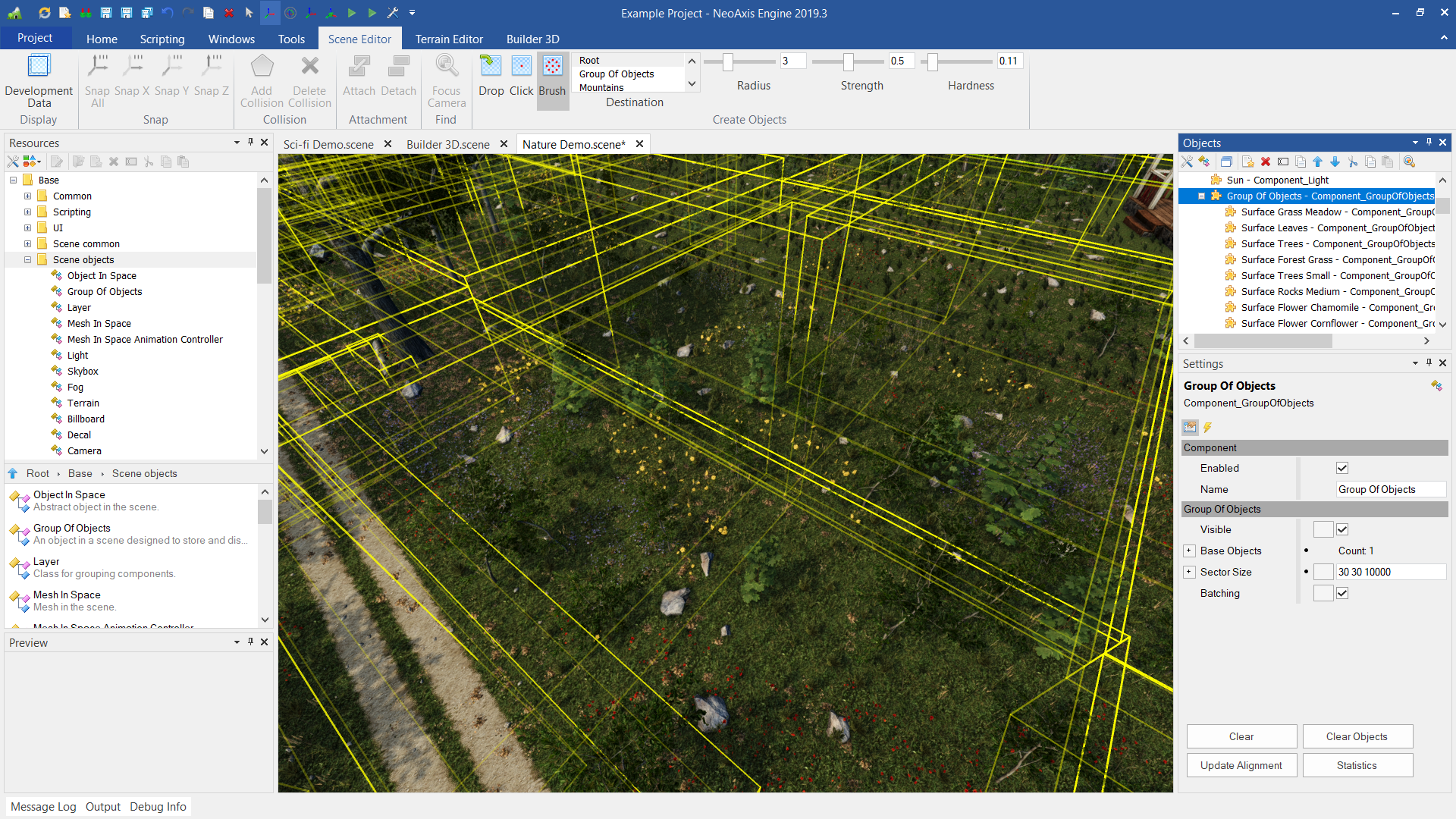 对于大量物体的管理和渲染,一种特殊的 对象组 对象已出现。 支持将场景编辑器的对象直接创建成对象组.
