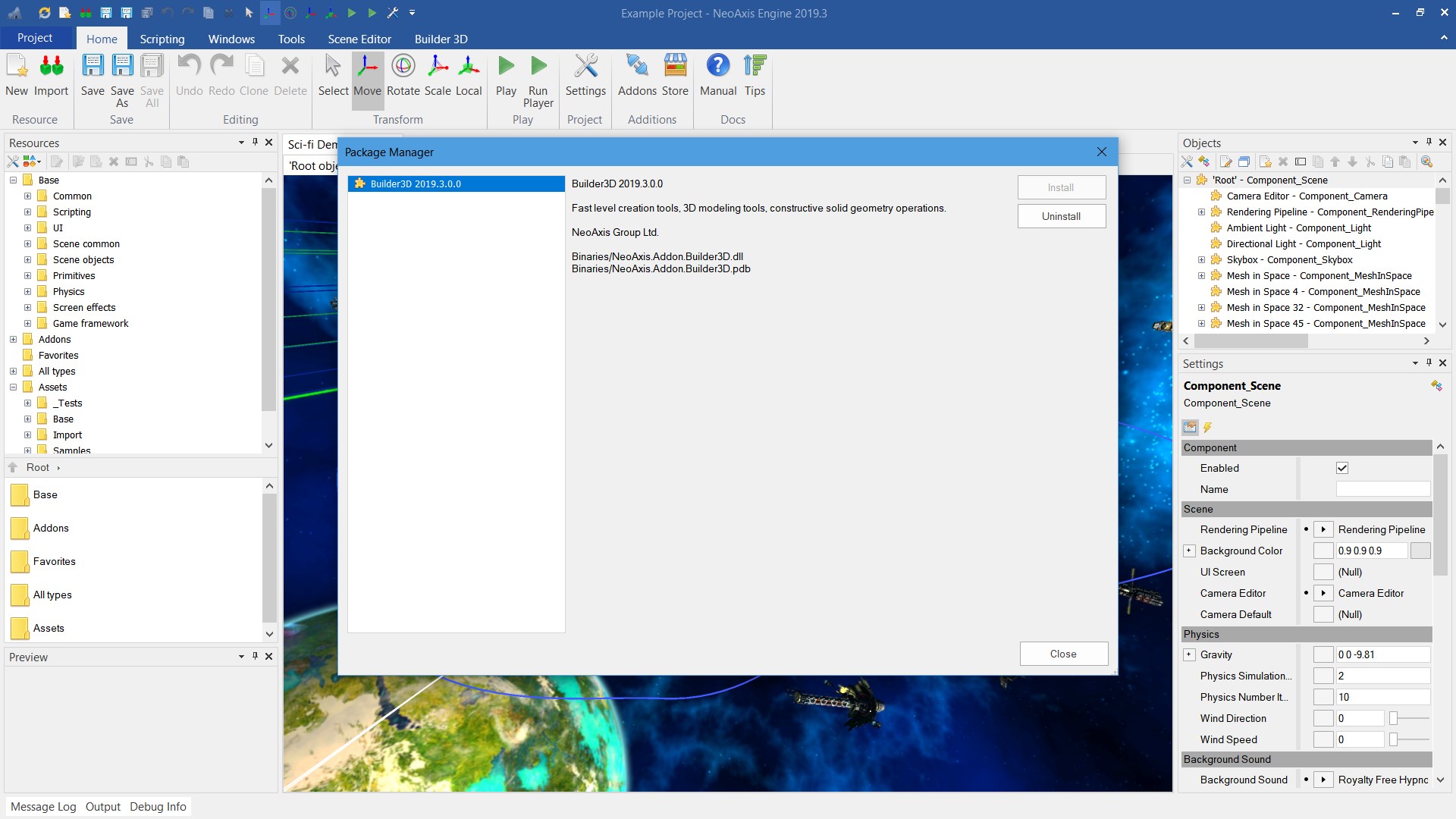 这个 构建器 3D 添加上作为场景编辑器的外延出现,用于编辑场景中位于几何水平的3D模型. 加法包括快等创建工具,三维建模工具,建设性固态几何操作. 所创建的模型既可以用作场景对象,也可以作为普通的3D模型.